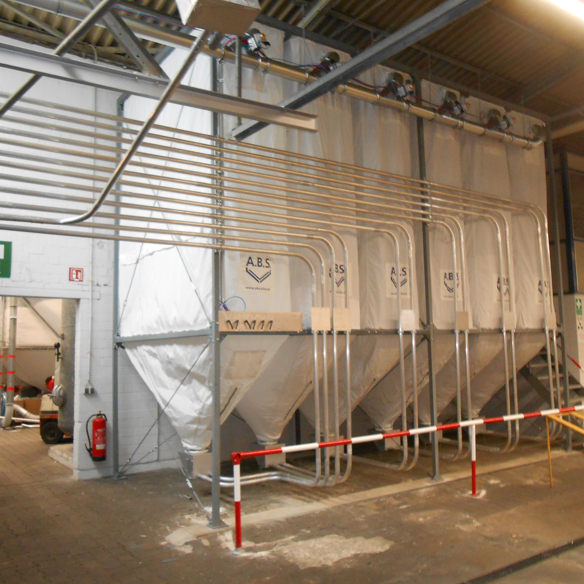 Ein technischer Berater der A.B.S. besuchte den Hersteller am Standort und analysierte die räumlichen Gegebenheiten. Er kam zusammen mit dem Unternehmen zum Ergebnis, dass es die beste Lösung ist, die Holzsilos durch flexible Gewebesilos als Mehrkammersilos zu ersetzen. Durch das geringe Eigengewicht stehen jetzt 6 anstatt 3 Lagersilos zur Verfügung, ohne den Hallenboden zu überlasten.