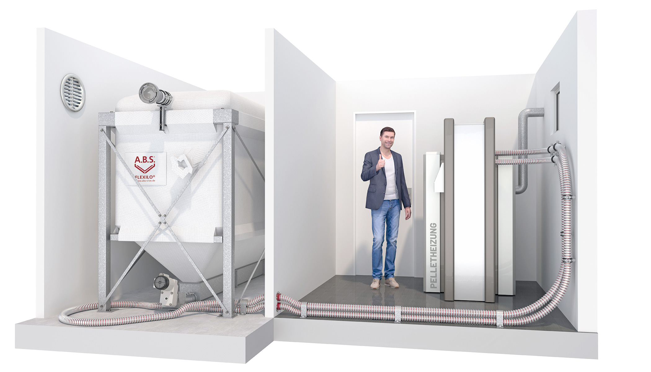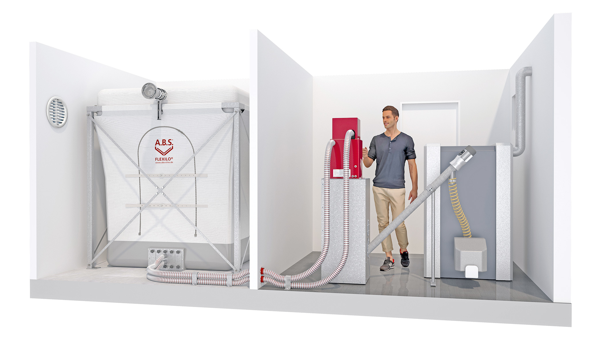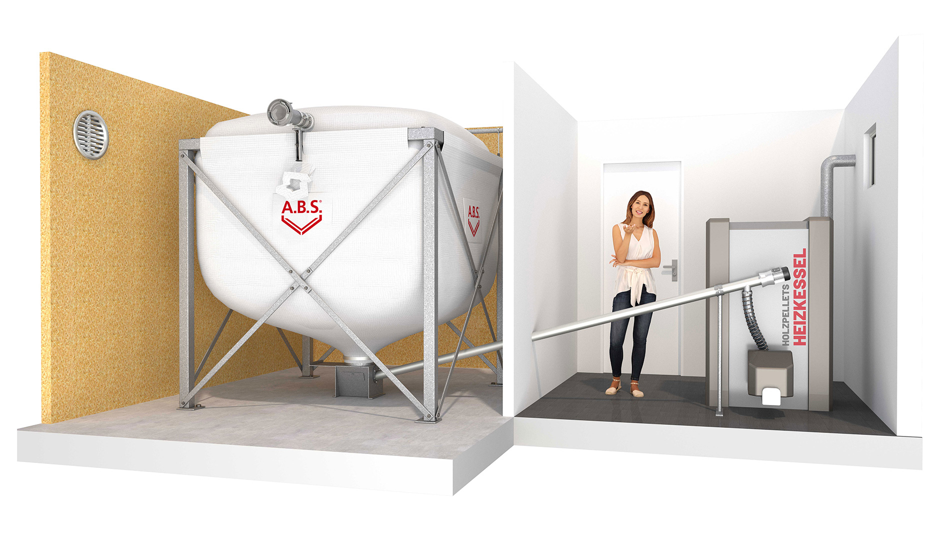 The wood pellets are delivered with a silo vehicle and blown into the flexible pellet store. When filling, the blown air escapes through the lid fabric of the silo. Therefore, forced extraction is not necessary (exhaust air opening of at least 400 cm² is required in the installation room). To maximize space utilization, the pellets are blown in horizontally above the support bar. The flexible walls and built-in impact protection ensure that the wood pellets are filled gently. The appropriate filling system is included in the scope of delivery of every A.B.S. silo, but may differ depending on the silo variant.