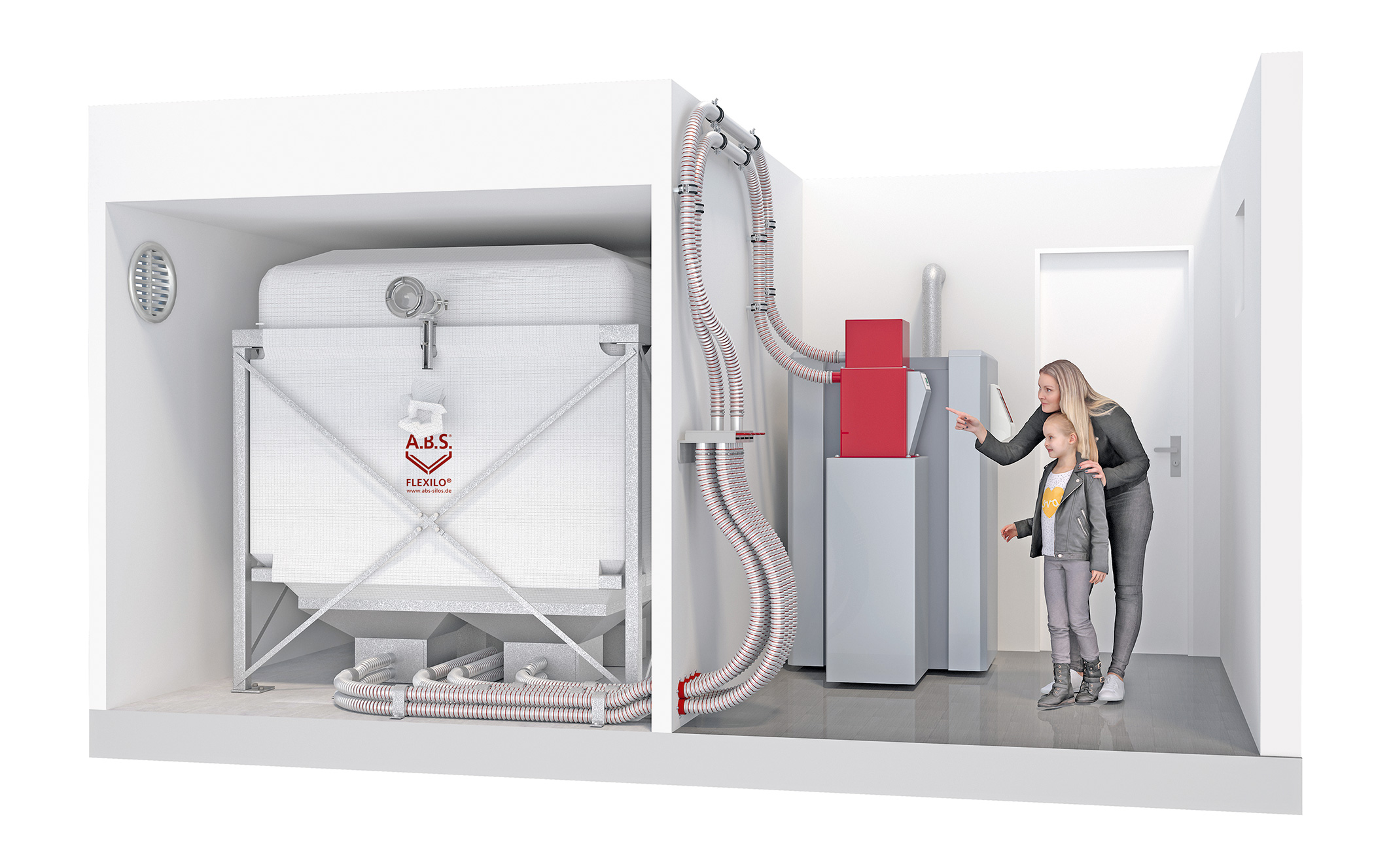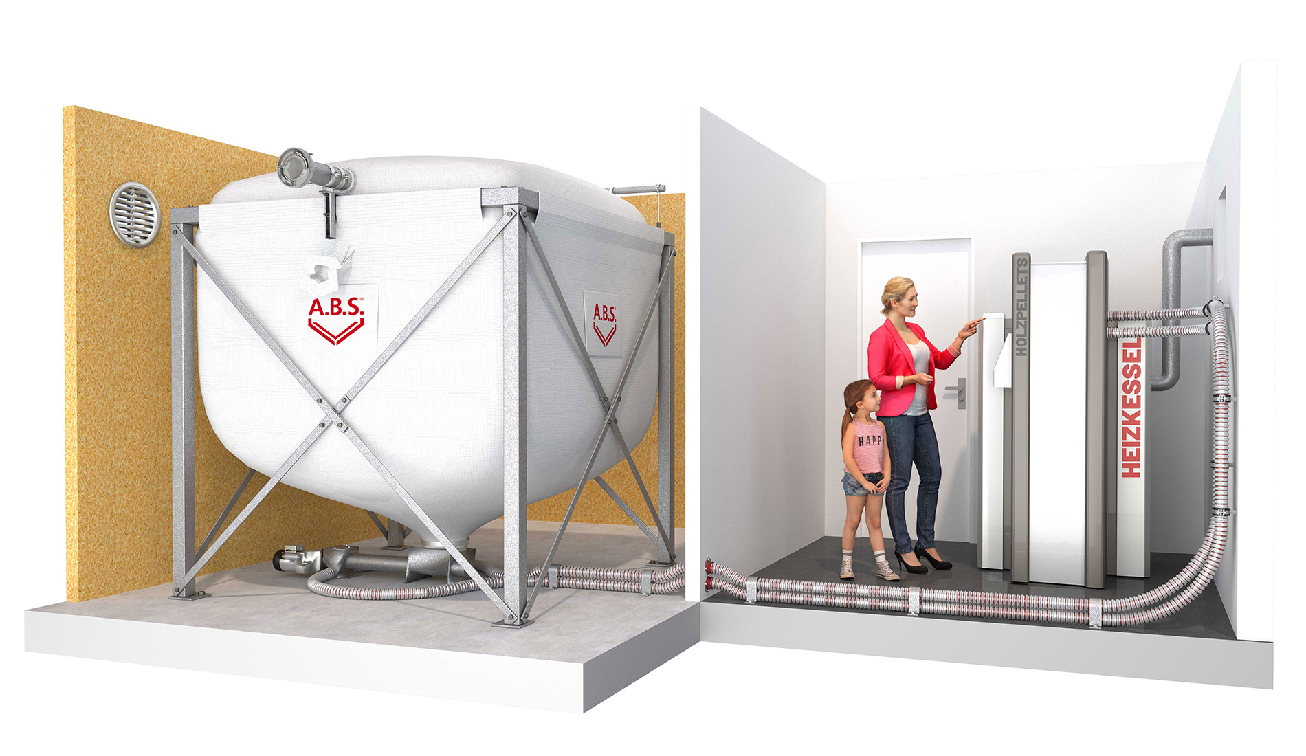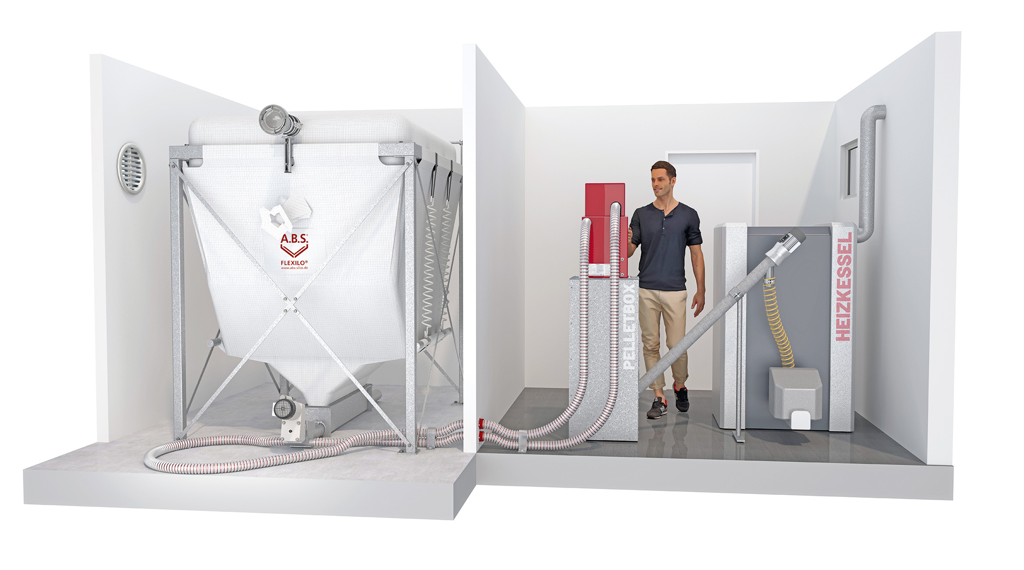 The wood pellets are delivered with a silo vehicle and blown into the flexible pellet store. When filling, the blown air escapes through the lid fabric of the silo. Therefore, forced extraction is not necessary (exhaust air opening of at least 400 cm² is required in the installation room). To maximize space utilization, the pellets are blown in horizontally above the support bar. The flexible walls and built-in impact protection ensure that the wood pellets are filled gently. The appropriate filling system is included in the scope of delivery of every A.B.S. silo, but may differ depending on the silo variant.