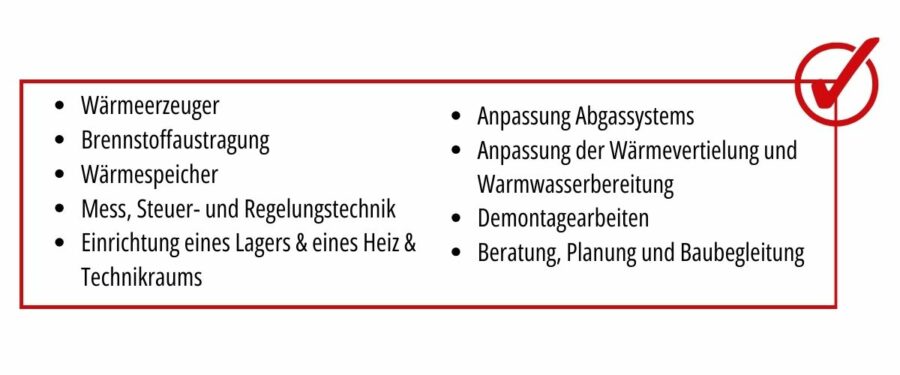 Die förderfähigen Kosten umfassen alle notwendigen Maßnahmen für die Vorbereitung und Umsetzung des Heizungseinbaus und alle damit zusammenhängenden Maßnahmen zur Erhöhung der Energieeffizienz der gesamten Heizungsanlage: Dazu gehören folgende Anlagenkosten und Kosten für Umfeldmaßnahmen (jeweils inkl. Installation und Inbetriebnahme):