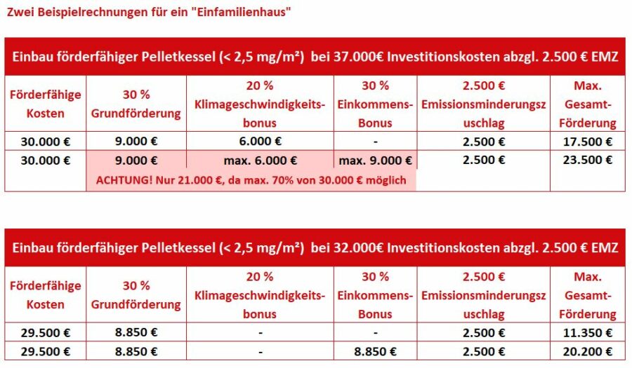 Wenn diese >= 32.500 € liegen, dann führt der Abzug des Emissionsminderungszuschlag von 2.500 € dazu, dass die maximalen Förderkosten von 30.000 € angesetzt werden und man kann bei Erhalt aller Boni auf eine max. Fördersumme von 23.500 € kommen (untere Beispiele in der nachfolgenden Tabelle)