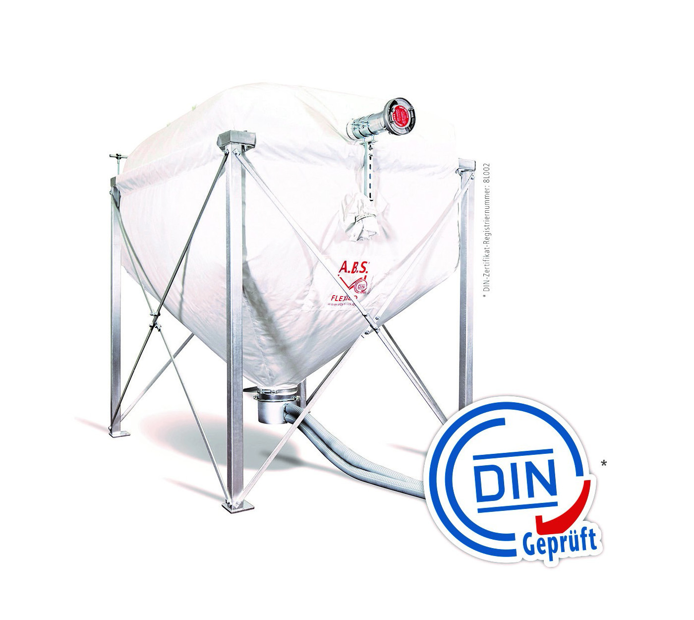 Um das Gütezeichen „DIN geprüft“ zu bekommen, stellt A.B.S. zum Beispiel die Zugänglichkeit für Wartungs- und Reinigungsarbeiten sicher. Im Pelletlager darf kein Kondenswasser auftreten, da Pellets durch Feuchtigkeit aufquellen und dann unbrauchbar sind. Zudem müssen die Lagerhersteller sicherstellen, dass bei der Befüllung keine Feuchtigkeit in das Pelletlager eindringt. Hohe Anforderungen werden an das Gewebe selbst gestellt. Sowohl der Silokorpus als auch der integrierte Prallschutz müssen antistatisch sein. Deshalb sind alle Pelletsilos von A.B.S. aus dauerhaft, elektrostatisch ableitfähigem Polyestergewebe hergestellt. Für den Nachweis der Standsicherheit der Stahlgestelle, in welche die Sacksilos eingehängt werden, erstellt A.B.S. die statischen Berechnungen, dies erfolgt unter Berücksichtigung der relevanten Normen.
