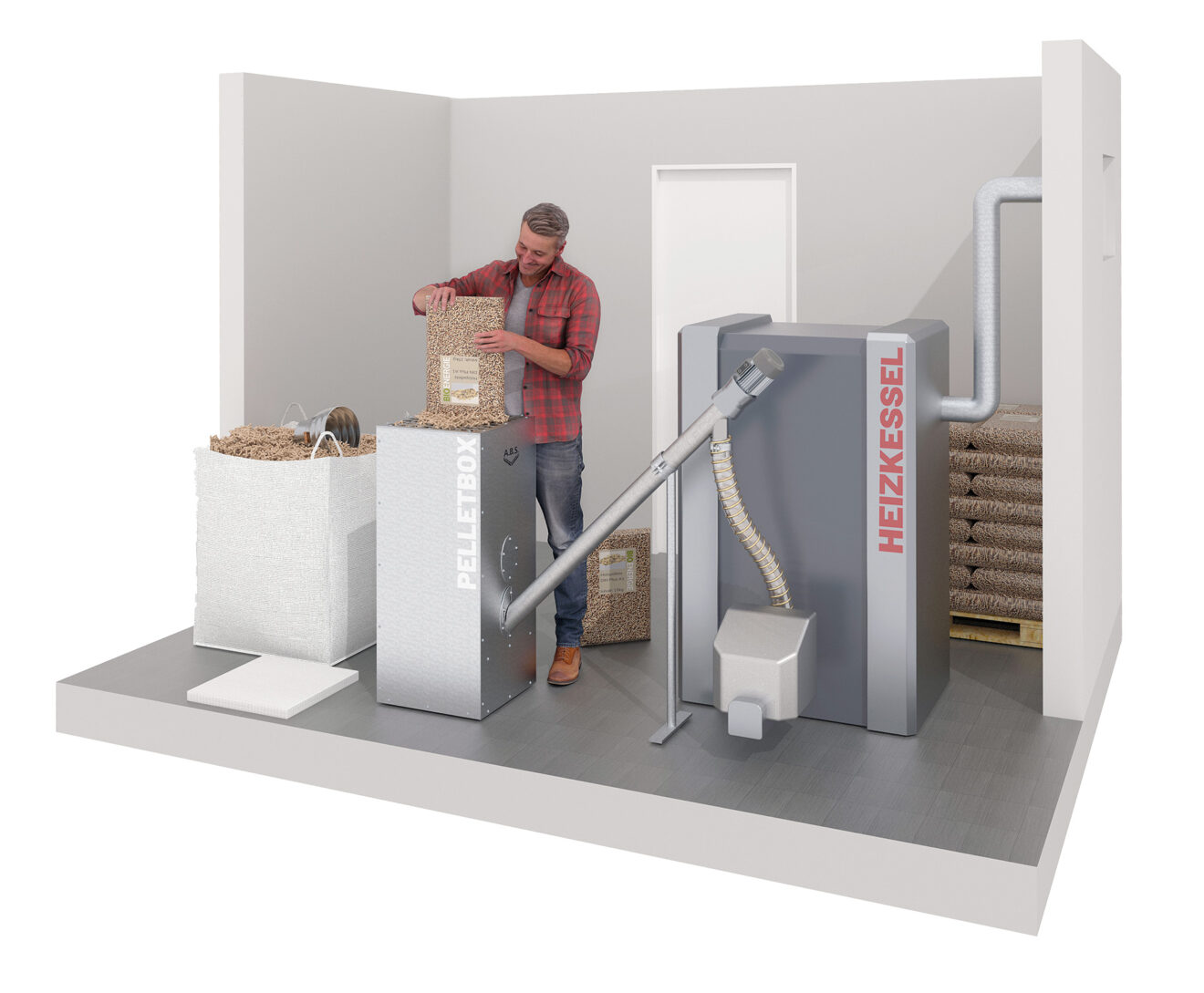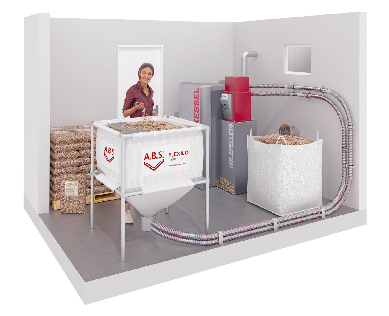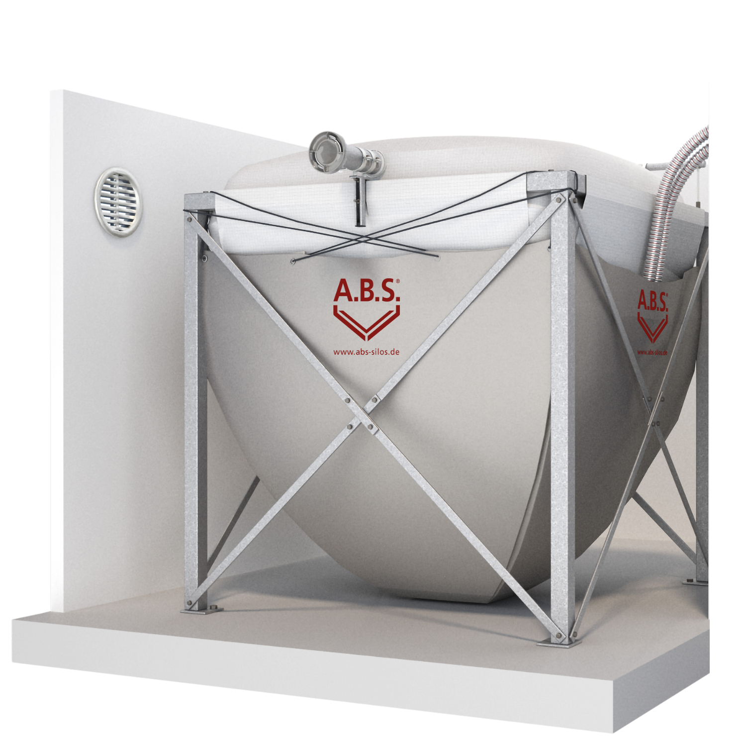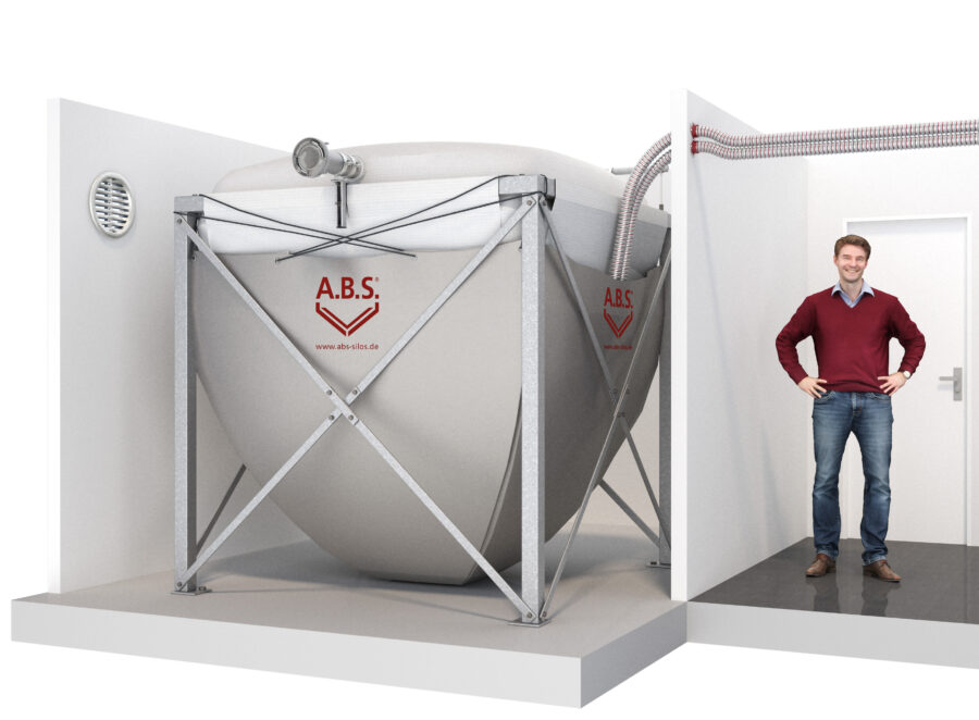 Kein Platz drinnen? Auch für draußen hat A.B.S. die Lösung. Beim Flexilo® AUSSEN wird das hochfeste, unbeschichtete und atmungsaktive High-Tech-Gewebe von einer speziellen Außenhülle geschützt. Dank der Luftumspülung zwischen Innen- und Außenhülle kann sich kein Kondenswasser bilden – so kommen die Pellets trocken und sicher vom Silo zum Heizkessel. Die verzinkte Stahlkonstruktion, die Ummantelung und die Dachabdeckung aus beschichtetem Polyestergewebe machen das Silo absolut witterungsbeständig.
